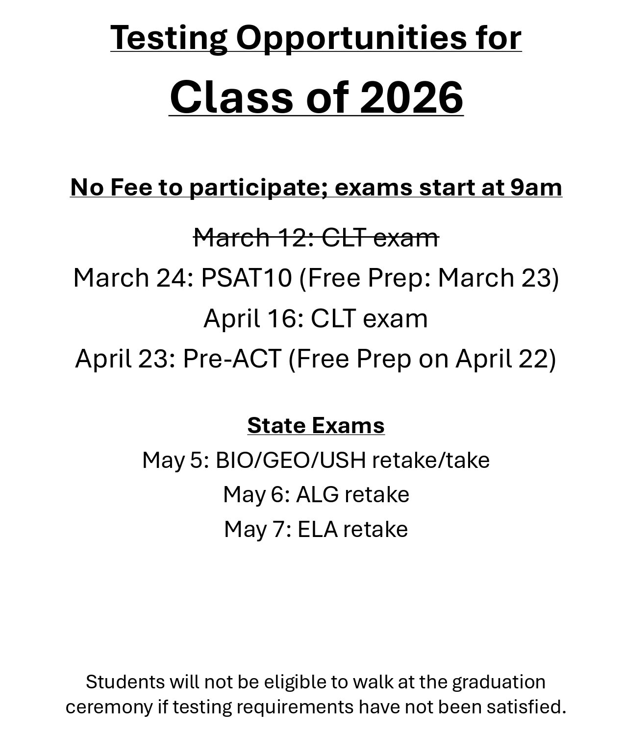 Alternative Exams The alternative exams to satisfy graduation requirements are CLT, SAT, ACT, or PSAT. Please check the testing calendar for specific dates, fees, or registration information.