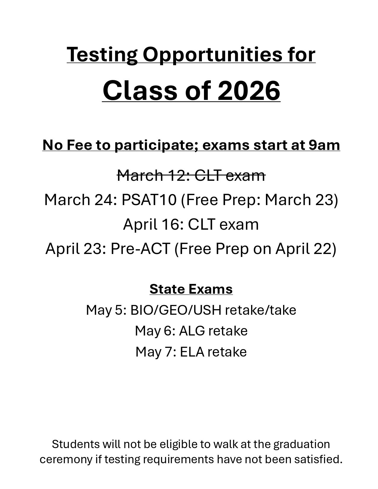 To earn a high school diploma from the State of Florida, students must earn the required course credits for the program in which they are enrolled (18 or 24), a grade point average (GPA) of 2.0 or higher, and achieve a level 3 on the Algebra and Reading State assessment. Other required exams include: Biology, US History, and Geometry; these exams will be calculated as 30% of the student’s grade in the course. The next available testing opportunities can be located on the Testing Calendar using the “calendar” tab above.