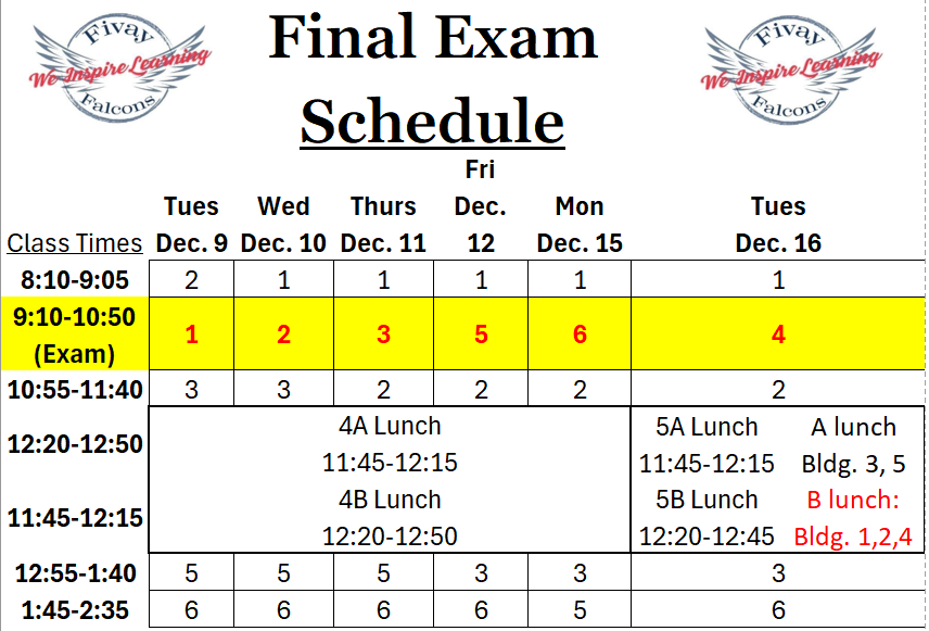 Please mark your calendars! The exam schedule will provide extended time for one class period each day. There is very little time for make-up exams, please make every effort to arrive by 9am each testing day in December.